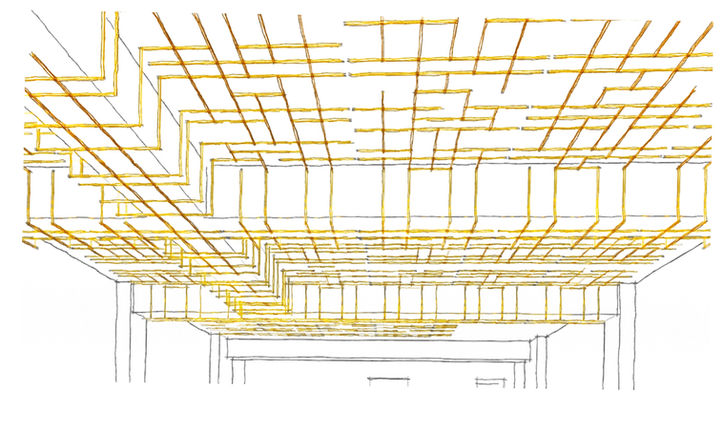 The ceiling is a intricate pattern of metal work that is finished with a gold touch that adds a level of sophistication to the space. Walls are treated with classical paneling which has subtle colours that don’t take away from the unique clothing on display but compliment and highlight them.
